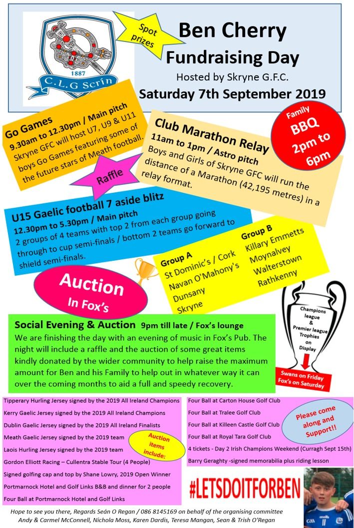 With the weekend on the way there is plenty to do. We are calling on everyone in Skryne to give a little this weekend. This is all about Ben a young Gaelic Footballer who has been diagnosed with Leukaemia. A talented Gaelic and Rugby player who always gives 110% on the field. A kid with great attitude and respect also.