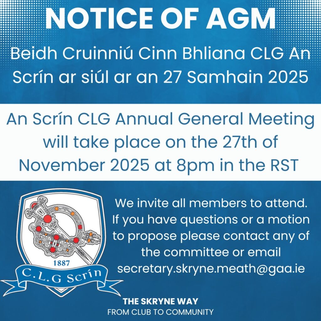 An Scrín CLG Annual AG General Meeting will take place on the 27th of November 2025 at 8pm in the RST.